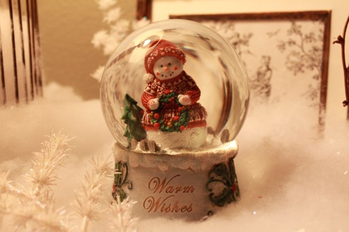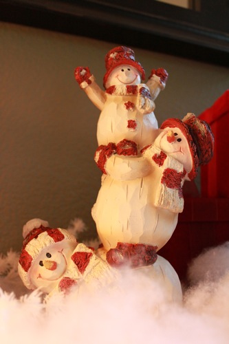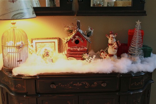 And here is the vignette on our entryway table complete with cute snowmen, birdhouses, and other things that don’t go together. But remember, I just do what I like! :)