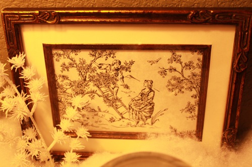 What a beautiful village! I had no idea there was a Wonderful Life Village out there. I’m going to drag DH to Lowe’s to check it out. The framed toile looks beautiful. What a great idea. I love your birdcage lamp!