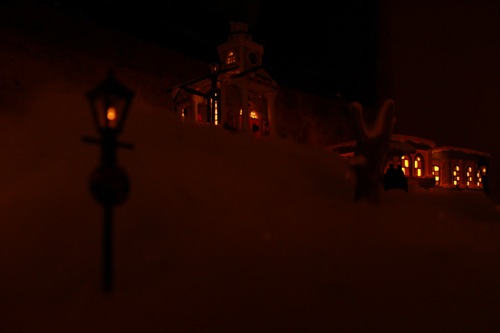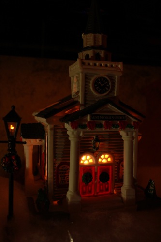 It’s the chapel on a hill. :) And what’s even cooler is that the “hill” is the center speaker my husband leaves on the entertainment center. I wish it could be hidden with snow all year round!