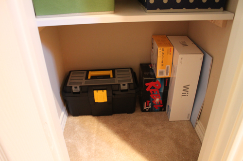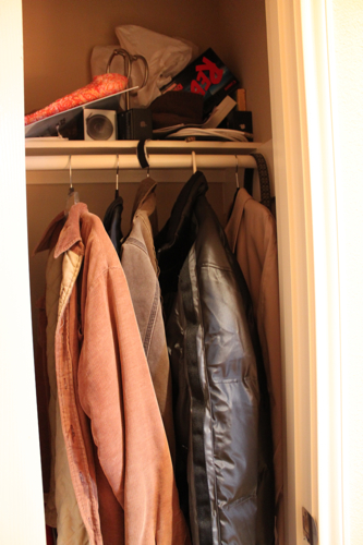 So, as you can see, this coat closet has turned into a junk closet. What’s great though is that I found my winter coat buried on the very bottom. I’ve been looking for it since we moved here! But seriously, we live in Texas, don’t have much of a Winter, so having a “true” coat closet really isn’t necessary for us. I just hung up our coats in our Master closet.