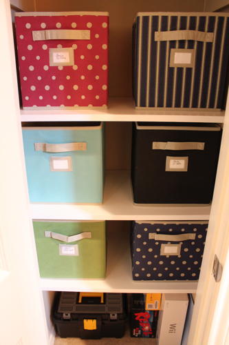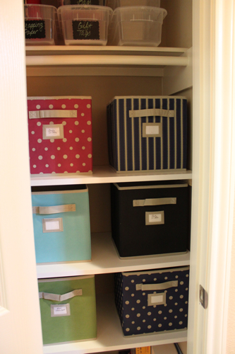 Love it! I turned our downstairs coat closet into an extra pantry for all of our cleaning supplies, paper products and vaccums and such a few years back using the Closet Maid wire shelving system. We already had a coat closet by the back door, and extra space in our office closet, so this was the perfect spot. No more running to the basement when we run out of paper towels! Love the cute bins…need to get me some of those!!