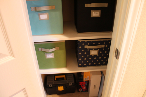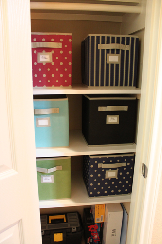 Ahhh, it feels so good to organize! And what’s even better is that there is stuff in only 2 of those fabric cubes right now. Plenty of storage space available! I purged a lot of junk when I cleaned the closet out. :)