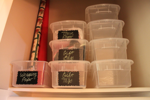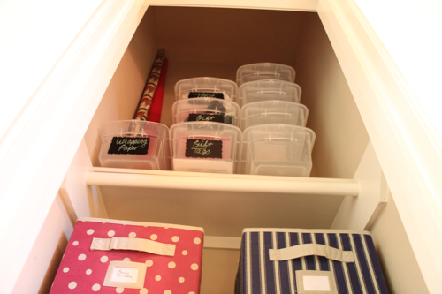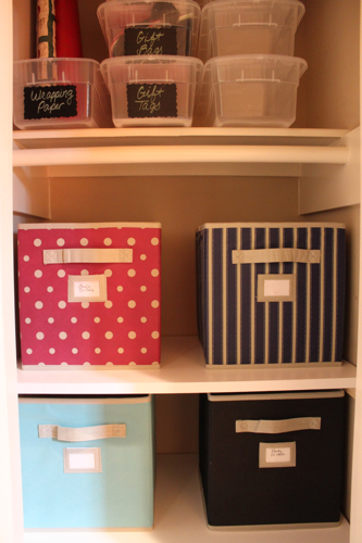 soooo great! i love the “whimsy” of the different baskets. and i like the way you used the height of the closet with the wrapping paper.