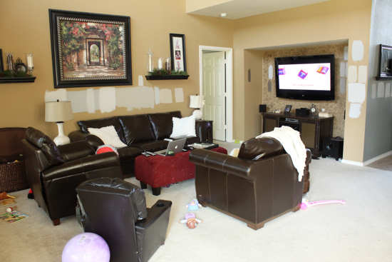 You might be asking yourself why there’s no ottoman or coffee table (yet). I never did move the old red ottoman back in here after I started redecorating. I just couldn’t stand to have that red thing stick out like a sore thumb when I loved everything else so much. I could recover it, but actually now I think I want a nice round fabric ottoman to break up some of the squareness of the room. I’ve been looking and looking but still nothing yet. I may just have to DIY an old round coffee table or something. So until then, we are enjoying the open space. :)