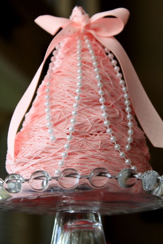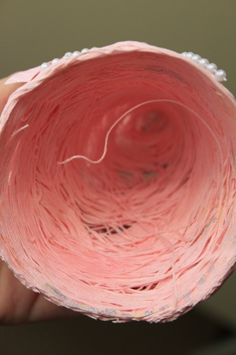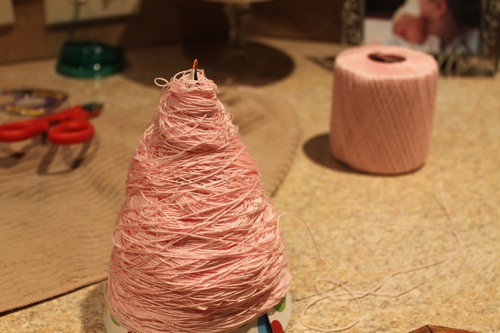 First you take some embroidery thread and a paper party hat. Then you tape the end of the thread on the inside of the hat and just start wrapping. And wrapping, and wrapping and wrapping. You’ll just have to mess with it and once you get in the groove, you’ll get it. It took me a few times to get it right. Here it is after it was wrapped up.