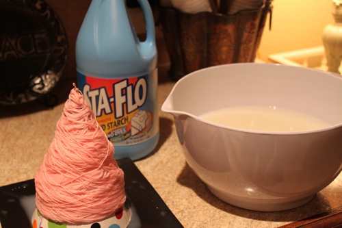 Then you take a bowl and fill it with liquid fabric fabric stiffener (you can find it at Wal-Mart or sometimes a big grocery store), and then dip the whole hat in there making sure it all gets soaked.