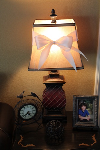 It’s no secret I love ribbons and bows. I have them in several spots. I love big fat bows on a lamp shade.