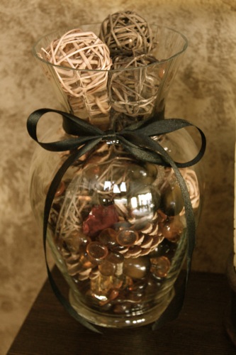 I have a vase like the one you have the ribbon on and I love that idea. I might have to steal that one ;) I think I may even have some pinecones around here too…