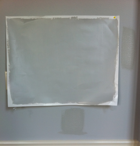 Here is a picture of my sample on the poster board, and you can see the blue-ish/purpley walls around it. Not right. And by this time I had already started testing new colors. And this is a terrible cell phone quality picture so it looks like tons of different hues.