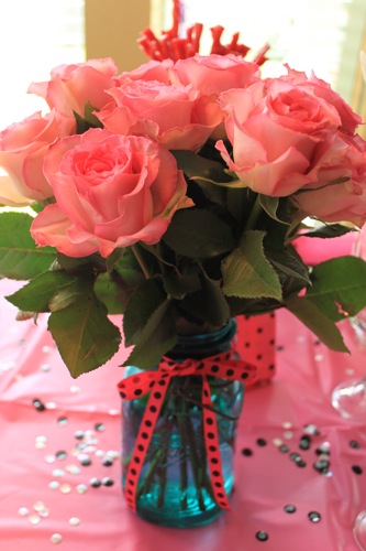 For the table centerpiece I used pink roses and used one of my blue mason jars.  I really like the blue and pink contrast.