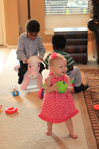 I think this picture is particularly funny with her 2 cousins in the background, that are obviously too big for the pink pony and the little push car.  Haha.  My sister and brother-in-law adopted these two boys from Haiti and they are the sweetest boys ever. Emma loves them!