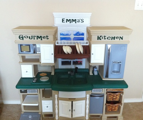 It wasn’t cheap by any means, but she will play with this for many years to come.  Heck, it was even a hit with her teenage cousins, so if Emma still plays with it when she’s older like that, it was money well spent. :)  I had that vinyl made at the sign shop and put on the kitchen instead of the stickers it came with.  It came with that vine-grapey stuff.  I think the vinyl is much more hip. :)