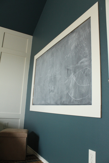 I love it!! We just did the entire lower wall of my kids’ new playroom in chalkboard and I was so nervous when it first started coming together – all that black. But it seems to work okay. I love the trim you put around it.