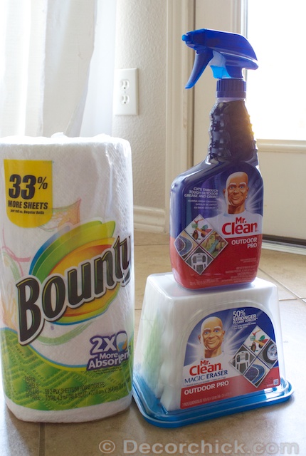I started out by cleaning our tables with the Mr. Clean Outdoor Pro spray and used the Bounty paper towels.