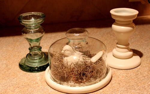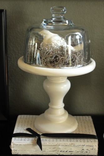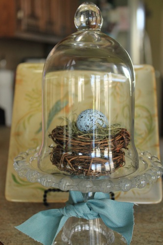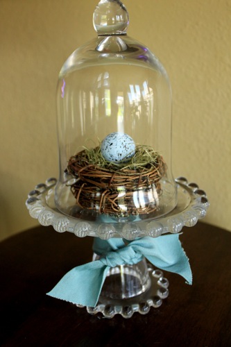 And lastly, here’s another cloche on a glass pedestal. Right now it holds a little nest and eggs. Yes, yes, I love birds and nests!