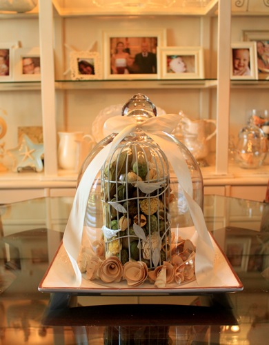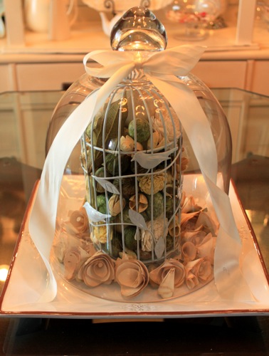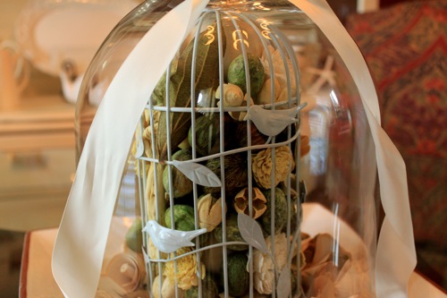 Inside the cloche is a white birdcage filled with yummy smelling stuff. Too bad I won’t be able to smell it! I even bought it already like that. Couldn’t pass up the birds and the cage. :) Then I took a wreath and pulled off the flowers and put around the plate on the inside.