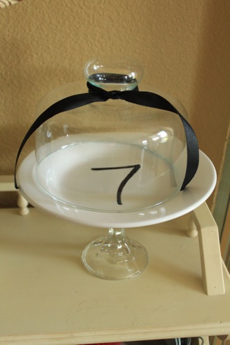 Here is another cheese dome lid that i’m using as a cloche, but I just used a white plate and glued a dollar store candlestick on the bottom. Then painted on lucky number 7 of course!