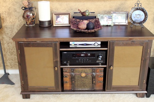 Entertainment center looks great!! Like it alot! I would add more tacks to the small table but it still looks great! You can buy the tacks on a roll where they are strung together so you can get them on really straight.