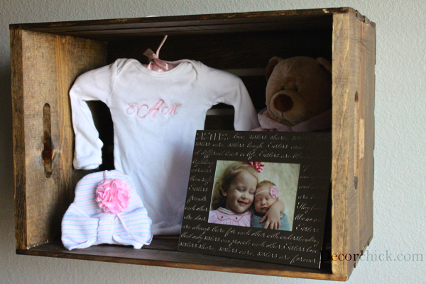 What do you think? I like that it’s a different way to display things, the crate hanging on the wall is a bit unexpected, and it’s just cool. :) I think I’m going to add a few more to this wall too. I haven’t fully decided yet but they would be cool as shelving for her books. So many options! And of course if you don’t want to hang this on the wall, you could just buy the crate already made then stain or paint it what you want, and do what you wish with it! Store magazines, blankets, toilet paper…anything goes. Actually, that’s what I’m going to do next…make one to use as a toilet paper holder because we don’t have one. :)