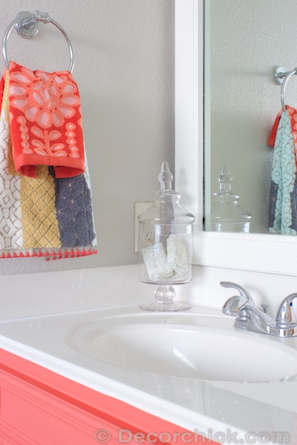 I absolutely LOVE this color! Your bathroom is almost the exact layout of mine, right down to the location of the little medicine cabinet. Bet I looked really silly carrying my laptop into my bathroom just now and holding the monitor up so I could see how the coral vanity would look in place of my white one. (Answer: awesome. I SO have to do this. Thanks for sharing it!)