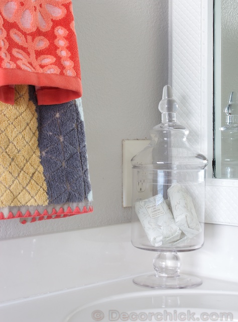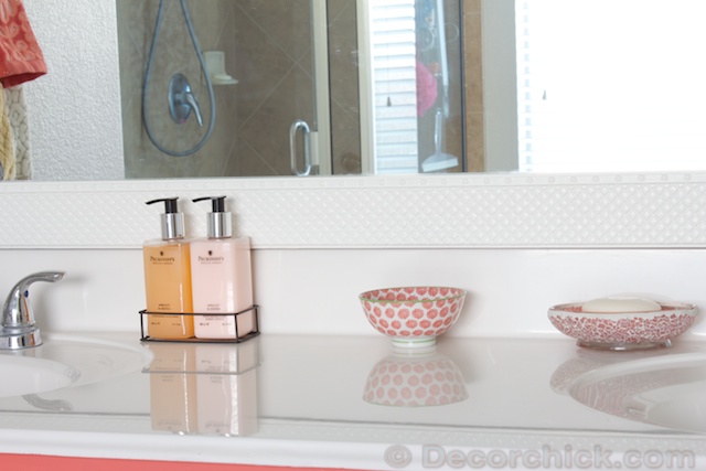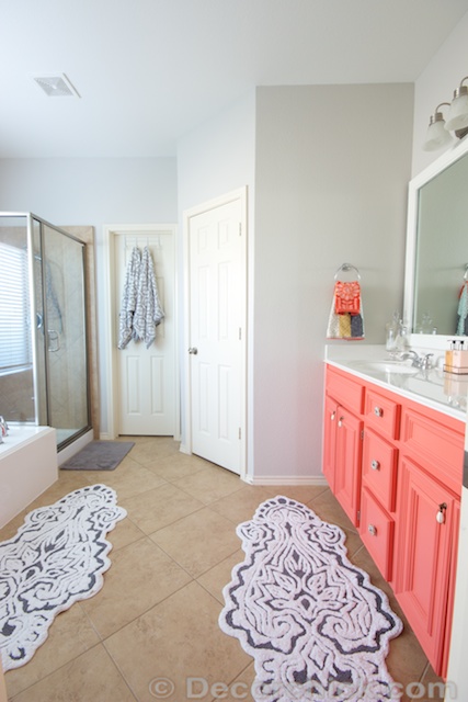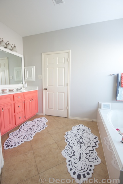 I really do love the vanity. And in the case of this room, the dark grey/white rugs and other accessories do a great job of balancing out the “girly-ness” of the coral vanity.