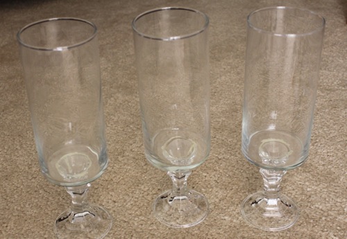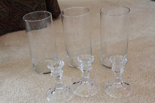 First get your hurricanes and glass candlesticks. Remember, get all of this from the dollar store. Never underestimate the power of a dollar. :)