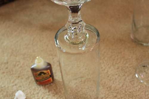 Then put some gorilla glue on the candlestick and stick to the bottom of hurricane. You could use hot glue too, but it will eventually come off. I’ve tried it before.
