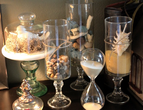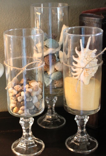 I made these for Christmas and put candles in them. I agree about the hot glue. Love seashells and sand!!!!!!!! You should come visit, we have the same decor strategy!
