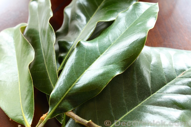 First I went in our backyard and cut off some magnolia leaves from our tree.