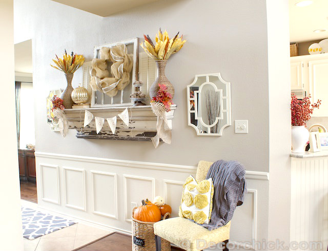 I absolutely love this mantel. I love the colors. Don’t you just love burlap ribbon!?! Thanks for sharing.