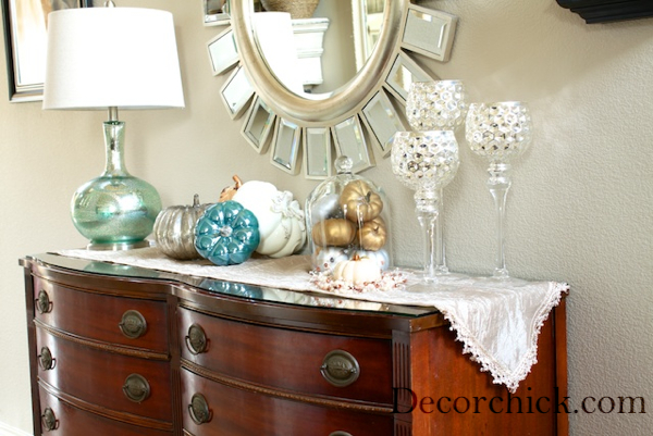 I kicked off Fall by first decorating our entry table, and I wanted to go with a more “elegant” look there with non-traditional Autumn colors. Since I love so many styles and colors, I tend to choose different areas of the house and do different looks. And here is what I came up with for the entry table.