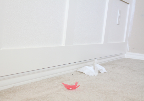 And if you are curious about the MDF sticking out from the baseboards because it is 1/2 thick, yes it does overlap a bit but it surprisingly doesn’t bother me. I’m not going to let our wimpy 1/4 inch baseboards prevent me from adding chunky molding anymore. :) And since no one will be looking at this particular wall from a side view, it really does not matter at all.