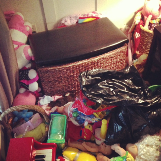 Well, apparently I am that mom. I really don’t know how it happens. Now granted, a lot of these toys are old and from when she was like 1 year old. I guess it’s my fault that I don’t go through them often enough and purge. It’s hard getting rid of toys for me. But knowing that they will bless someone else is how I’m able to do it. Needless to say, that black bag you see in the picture is when the toy ninja paid us a visit and went to town. ;)