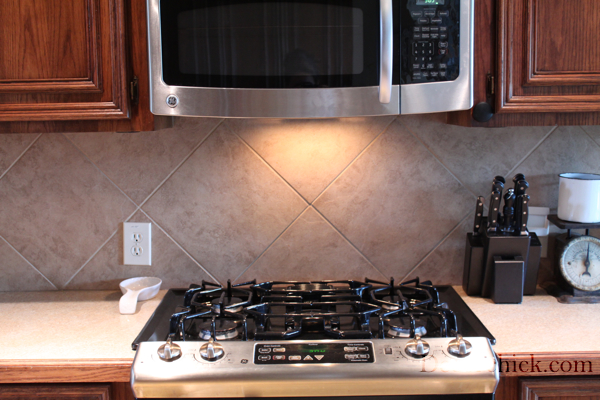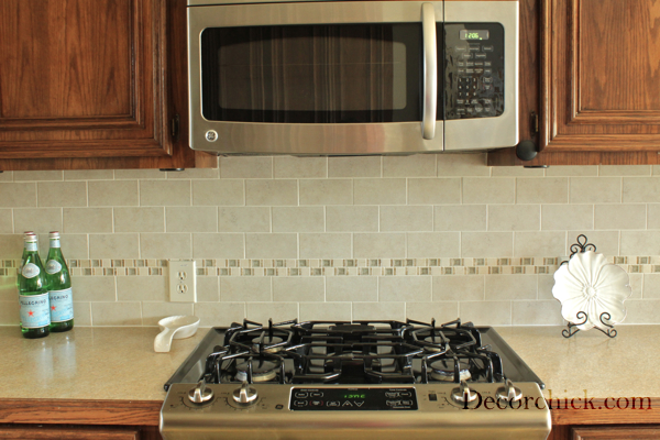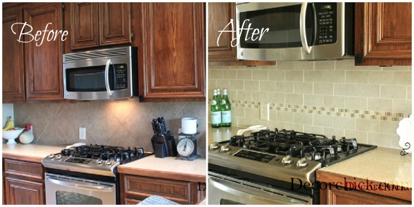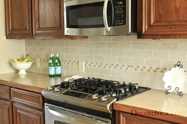 The new backsplash is beautiful! Such an improvement from the previous one!! Love the decorative accent piece & lighter/ brighter look it gave to your kitchen!! Gorgeous!