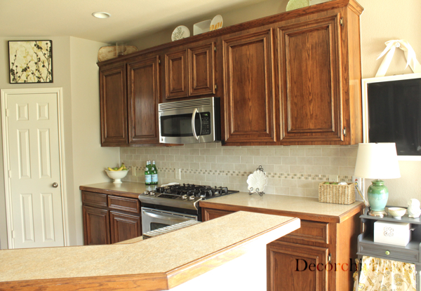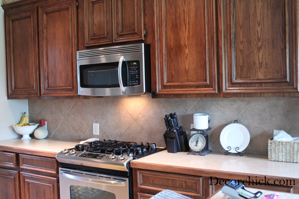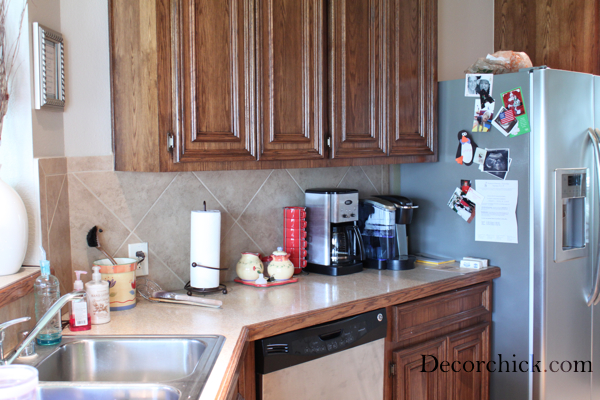 And no I didn’t take the time to clean for the before photos.  But I did take this makeover opportunity to de-clutter our countertops.  Gosh they were bad!  And notice the beige backsplash right?