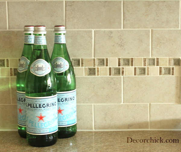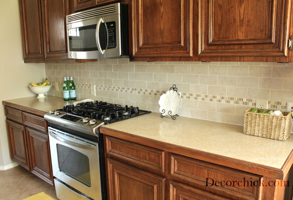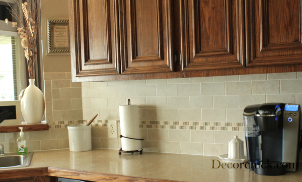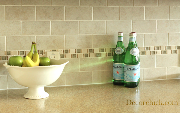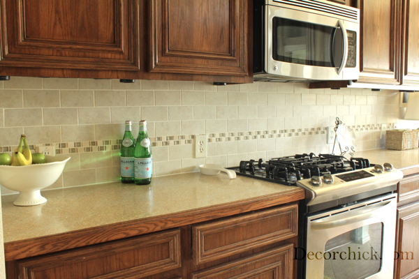 I love the accent row of glass. That totally makes it. I am going to be brutally honest and say I thought the original backsplash looked like floor tiles on the wall.. this is much better! :) love it!