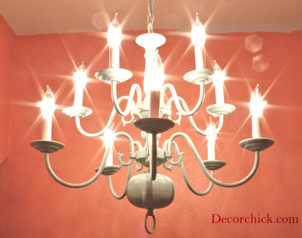And we also had that ugly florescent light in here, which was replaced with this $8 thrift store chandelier that I redid.