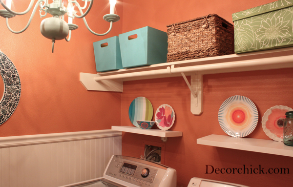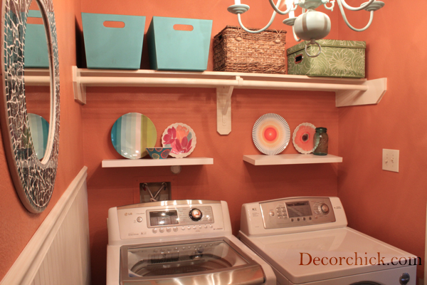 OMG, I LOVE the orange!! And who knew a laundry room could be soo cute??!! Question: does the vibration of the machines make the plates fall off?? That would be my only worry.