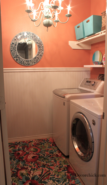 OhMyGosh this room makes me so fantastically happy! The colors are AMAZING! I love the chandelier and the bead board wall and the color and the aqua pops…oh man do I love it! I would do laundry 6 times a day in that room! :)