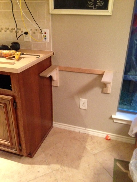 They nailed in the 2 corbels (that were custom built) and the support/brace on the back wall. Then they just nailed the wood pieces right on top.