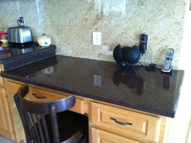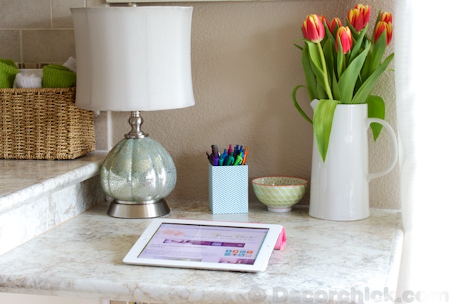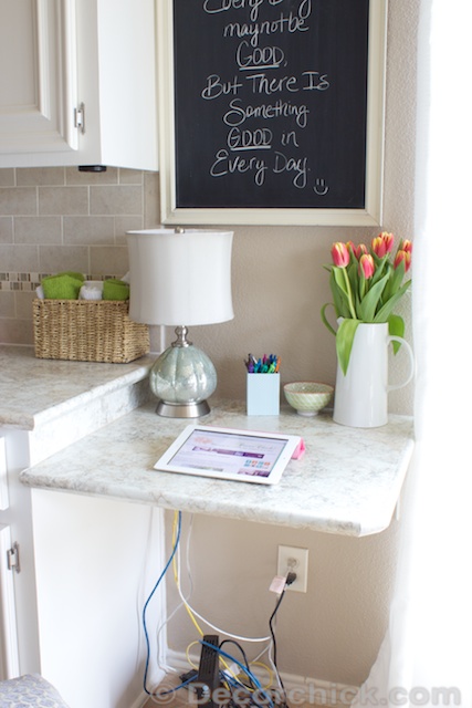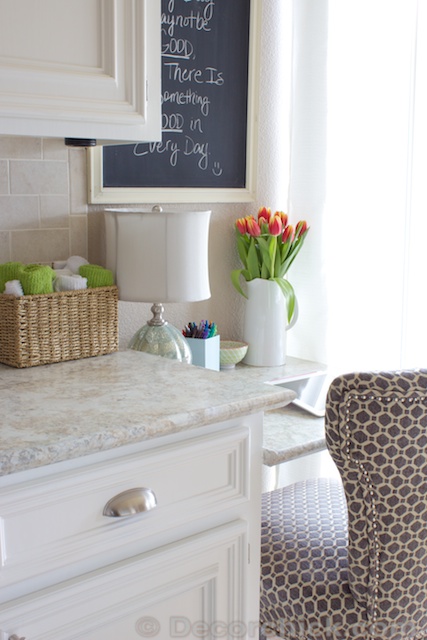 When I first started the countertop job I wondered if it was possible if we could make a little desk area in that spot. And when the guys came over for the initial consult, they said sure and that it would be an easy job. I was SO excited. Excited that the kids will have a little space to work and draw on, a place for a laptop and a place where my husband can work too. Because he doesn’t really use my desk in the office. Probably because I’m always at it. :) And I am not calling this a kitchen command center because it is not that. This area is meant to stay clean and pretty and not a paper organizer.