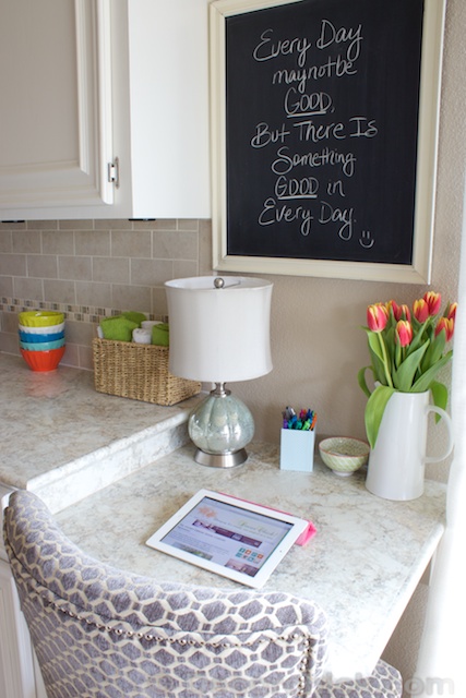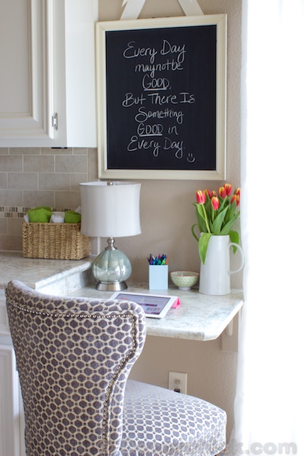The chalkboard quote I found on Pinterest, but could not find a source. If you know of it let me know! But I just love our new little kitchen nook. It feels good to really use every inch of square feet in your home that you can. It’s kind of like we just added on another little mini office. Love it!