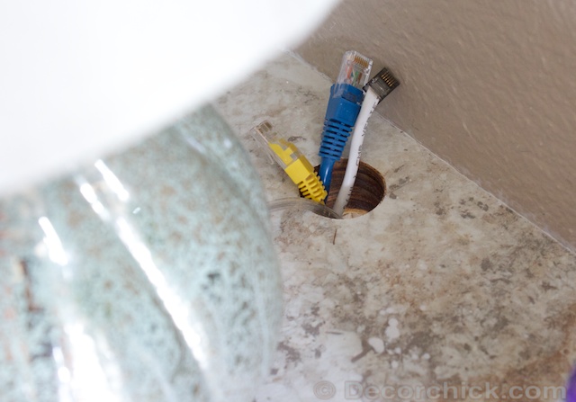 Now, since we do still keep our internet router down here (the wires connect up on the backsplash behind that wicker basket with the towels in it. Dumb, I know), I had them drill out a hole in the back of the desk so I could run cords and wires through easily.
