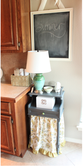 I liked that stand (even though my lamp was too big), but as far as functional, it really wasn’t. It was a good spot to hold my chalk for the chalkboard, and then of course underneath that skirt is our internet router that I was trying to hide. But other than that, that’s about it.