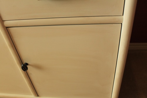 First I lightly sanded the buffet table because it had that super glossy finish. I really don’t think the sanding did much though. Sorry I don’t have any “during” pics because I did all of this at night in the garage. That makes for awful pictures. After wiping the dust off, I sprayed a few coats of polycrylic to seal in the wood finish, then I primed both pieces with spray primer. When that was dry, I spray painted them with Rustoleum Heirloom White. I went through SEVERAL cans of spray paint.