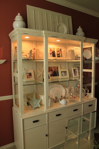 I decorated the top of the hutch with some shutters I found at the thrift store that I painted Heirloom White as well, and a few urns from Homegoods. :) Got new hardware for the buffet too.