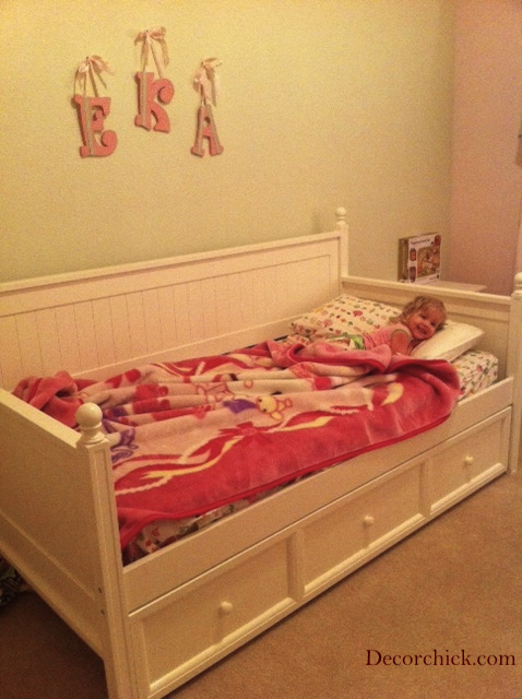 I knew all along I wanted a daybed for her room because I love the look of them, and they save so much space in a room giving her more playroom in there because you won’t have a big bed sticking out in the middle of the room. And here’s the new big girl bed.