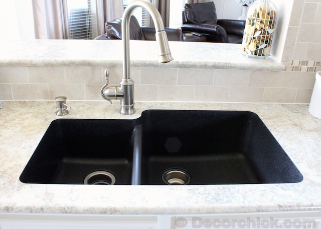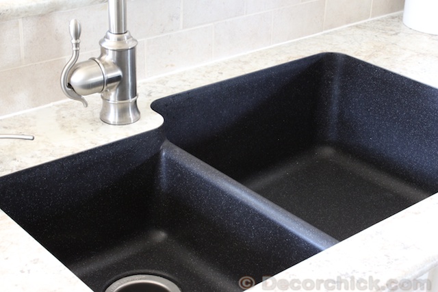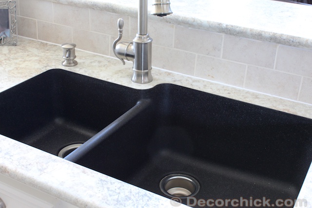 When we updated our kitchen we chose a black quartz sink too. Originally I was going to go with a lighter bisque color to match the color we painted the cabinets, but since we did a darker granite for the counter-tops, the light sink just stood out too much. We have black specs in the counter so it looks great! Love how your kitchen turned out!