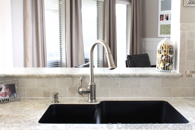 Another thing I LOVE about my sink is how massive it is compared to my old one. And it’s deep. It is SO nice to have. The right side is very large and deep, and the left side is smaller and sits up a bit higher. I wasn’t sure how I’d like the 2 different size bowls, but I actually love it. The only thing we had to get used to was having the garbage disposal moved to the left side. Not a big deal now. Have I mentioned I love my sink yet? Yea, I do. Very much.