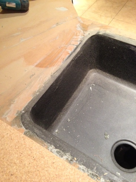 Craftmasters here in Houston did the install and they did amazing work. Most of the countertops were built here on site, but the grooves were already routed out for the sink when they got here. They used a special glue to bond the sink to the wood, flipped it over and inserted it on top of the cabinet bases.